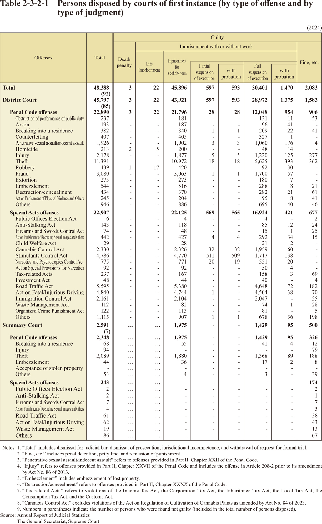 Table 2-3-2-1 Persons disposed by courts of first instance (by type of offense and by type of judgment)
