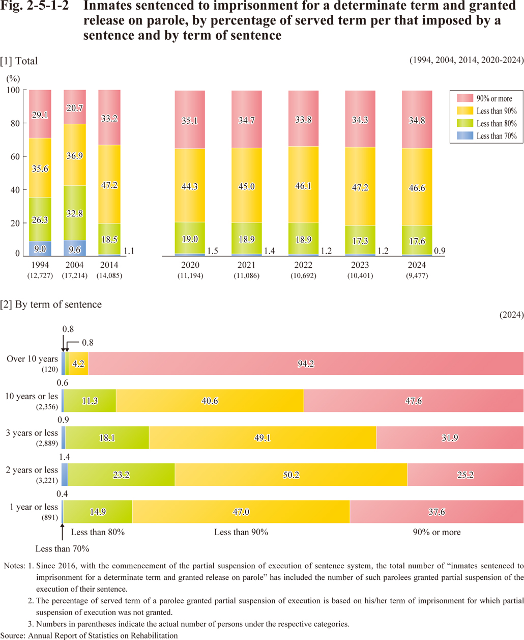 Fig. 2-5-1-2 Inmates sentenced to imprisonment for a determinate term and granted release on parole, by percentage of served term per that imposed by a sentence and by term of sentence