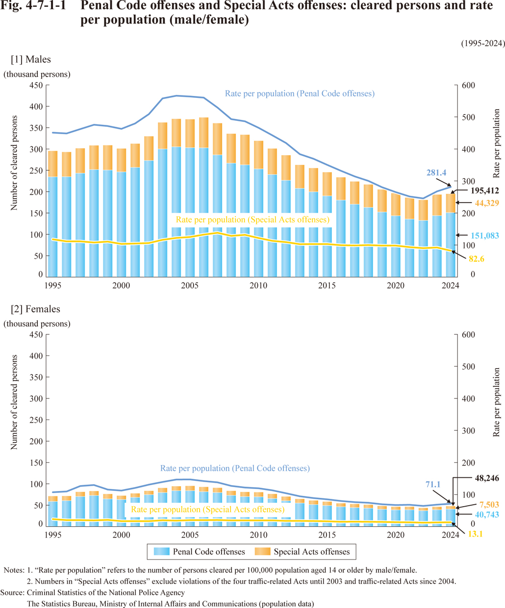 Fig. 4-7-1-1 Penal Code offenses and Special Acts offenses: cleared persons and rate per population (male/female)
