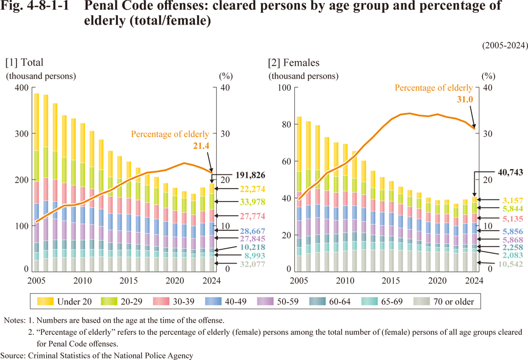 Fig. 4-8-1-1 Penal Code offenses: cleared persons by age group and percentage of elderly (total/female)