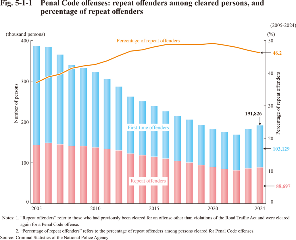 Fig. 5-1-1 Penal Code offenses: repeat offenders among cleared persons, and percentage of repeat offenders