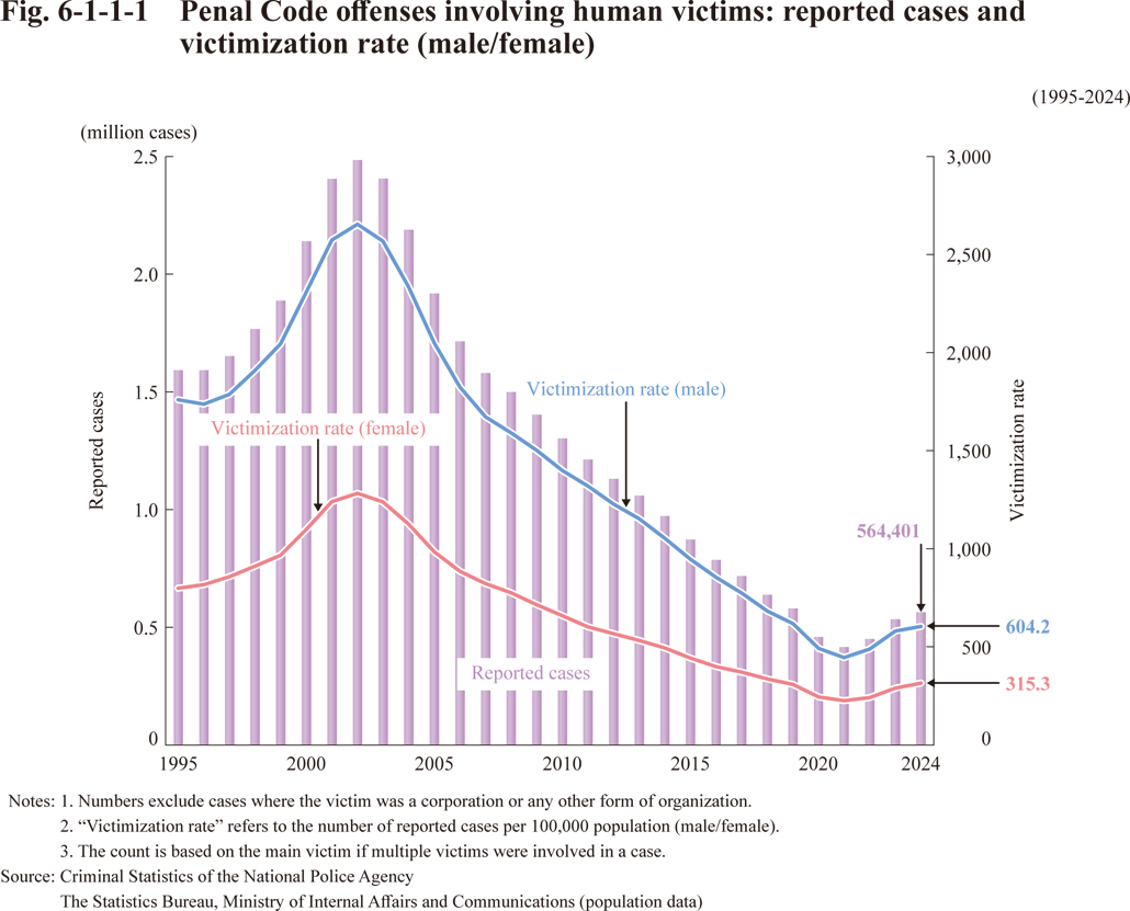 Fig. 6-1-1-1 Penal Code offenses involving human victims: reported cases and victimization rate (male/female)