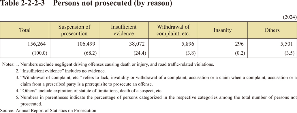 Table 2-2-2-3 shows the number of persons not prosecuted by reason of non-prosecution (excluding negligent driving offenses causing death or injury and road traffic-related violations) in 2024.