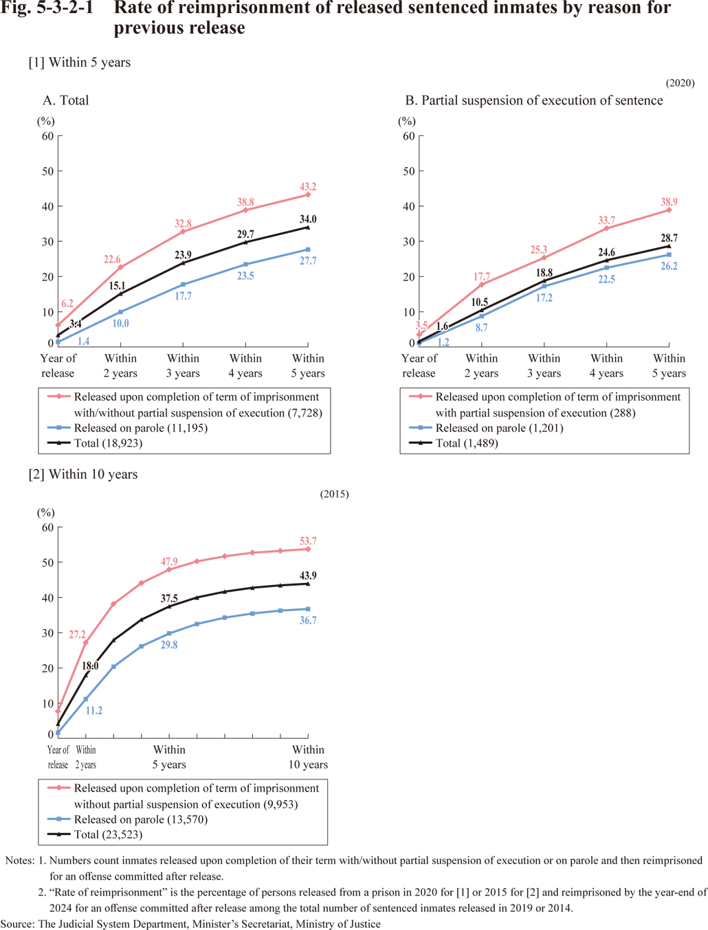 Fig. 5-3-2-1 shows the rate of reimprisonment within the period of five and 10 years after the release of sentenced inmates released in [1] 2020 and [2] 2015 by reason for the previous release (either released upon completion of the term or released on parole; hereinafter the same applies in this Section).