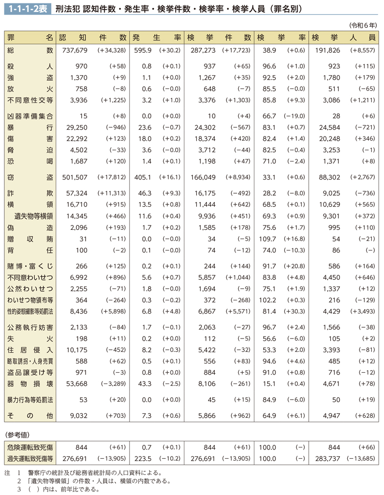令和6年における刑法犯の認知件数・発生率等を罪名別に見ると、1-1-1-2表のとおりである。