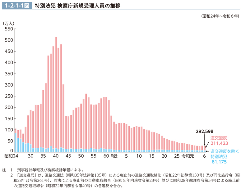 特別法犯の検察庁新規受理人員の推移(昭和24年以降)は、1-2-1-1図のとおりである(罪名別の人員については、CD-ROM資料1-4参照)。その人員は、特別法犯全体では、43年に交通反則通告制度が施行されたことにより大幅に減少した後、50年代は200万人台で推移していたが、62年に同制度の適用範囲が拡大された結果、再び大幅に減少した。その後は減少傾向にあり、平成18年からは昭和24年以降における最少を記録し続けていたところ、令和5年は増加し、6年は再び減少した。他方、道交違反を除く特別法犯では、平成20年から緩やかな減少傾向にあり、令和6年は8万1,175人(前年比3,156人(3.7%)減)であった(CD-ROM参照)。
