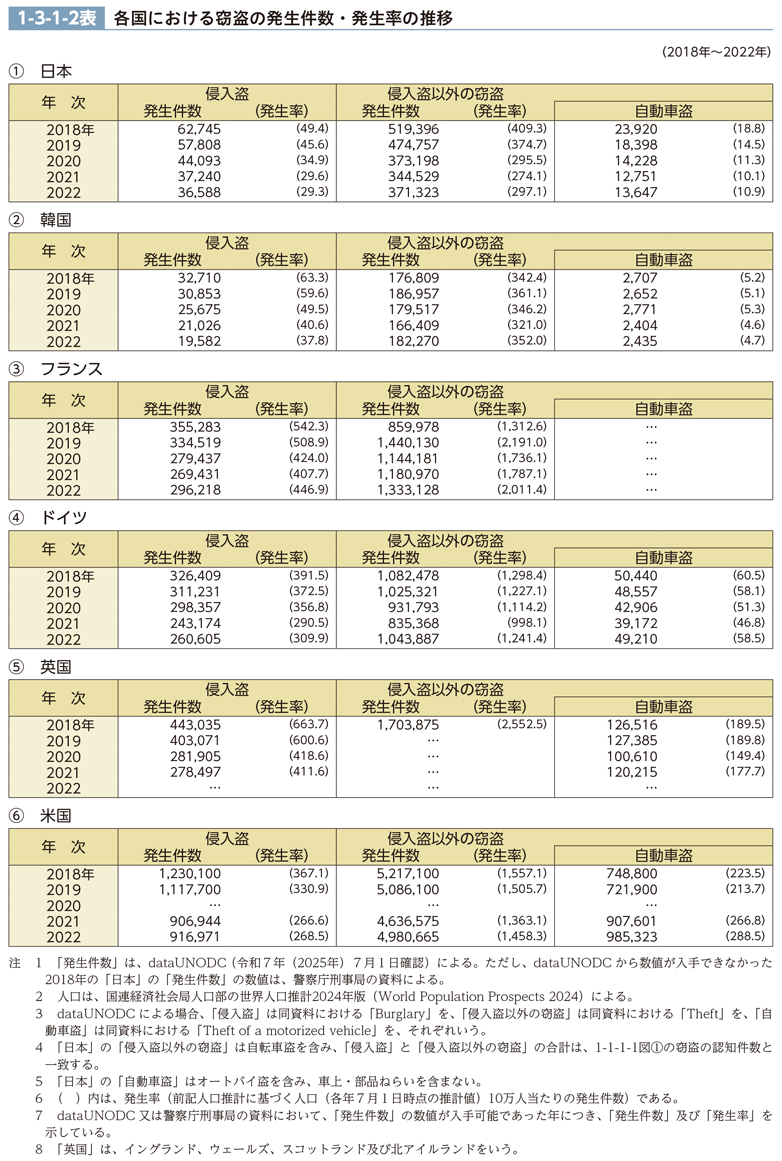 この項でいう「窃盗」とは、dataUNODCにおける「Burglary」(「侵入盗」)と「Theft」(「侵入盗以外の窃盗」)の二つの類型をいう。各国における各類型の発生件数及び発生率の推移(令和4年(2022年)までの最近5年間)を手口別に見ると、1-3-1-2表のとおりである。