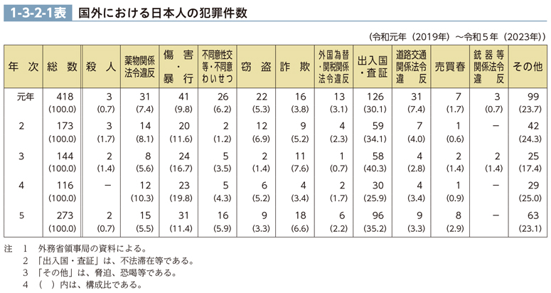 在外公館が邦人援護業務を通じて把握した国外における日本人による犯罪件数を罪名・罪種別に見ると、1-3-2-1表のとおりである。