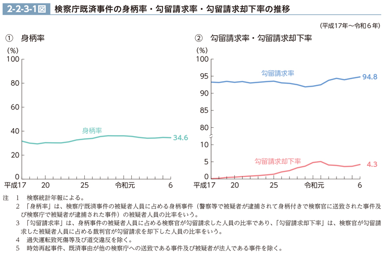 勾留請求率は、平成5年以降、90%台前半で推移している(CD-ROM参照)。勾留請求却下率は、18年以降、毎年上昇していたが、令和2年以降4%前後で推移しており、6年は4.3%(前年比0.5pt上昇)であった。