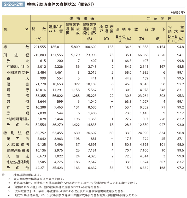 令和6年における検察庁既済事件について、被疑者の逮捕・勾留人員を罪名別に見ると、2-2-3-2表のとおりである。