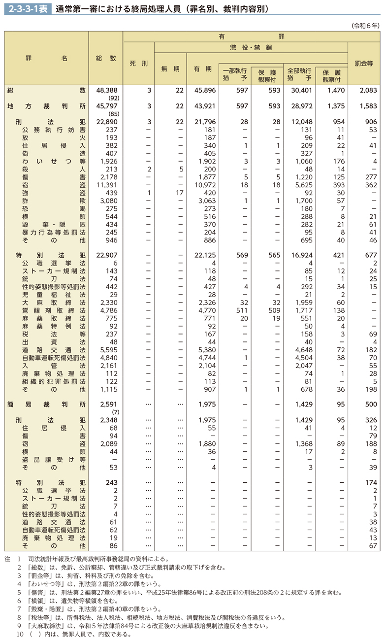 2-3-3-1表は、令和6年の通常第一審における終局処理人員を罪名別に見るとともに、これを裁判内容別に見たものである。通常第一審における終局処理人員は、最近10年間では減少傾向にあるところ、6年は4万8,388人(前年比8.3%増)であった(司法統計年報及び最高裁判所事務総局の資料による。)。