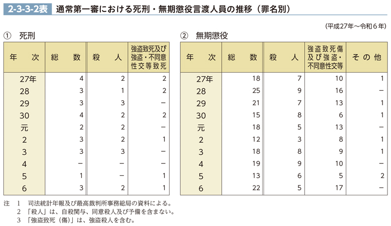 最近10年間における死刑の言渡しは、殺人(自殺関与、同意殺人及び予備を含まない。)、強盗致死(強盗殺人を含む。以下この章において同じ。)及び強盗・不同意性交等致死(不同意性交等に係る法改正については、第1編第1章第2節4項及び第2編第1章1項(3)参照)に限られている。