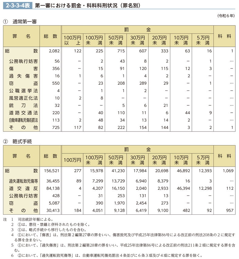 令和6年における第一審での罰金・科料の科刑状況は、2-3-3-4表のとおりである。
