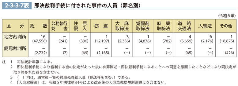 令和6年に即決裁判手続に付された事件の人員を罪名別に見ると、2-3-3-7表のとおりである。同年に地方裁判所において即決裁判手続に付された人員は16人(前年比1人減)、簡易裁判所においては0人(同1人減)であった。