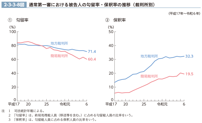 保釈率については、地方裁判所の方が簡易裁判所よりも約7~15pt高い水準で推移している。地方裁判所では、平成15年(12.7%)を境に16年から上昇傾向にあり、令和6年は32.3%(前年比0.4pt上昇)であった。簡易裁判所でも、平成16年(5.3%)を境に上昇傾向にあるところ、令和6年は19.5%(同0.7pt低下)であった(CD-ROM参照)。
