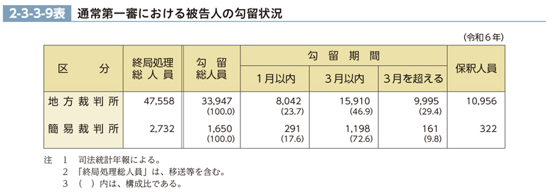 令和6年の通常第一審における終局処理人員について、被告人の勾留状況を見ると、2-3-3-9表のとおりである。