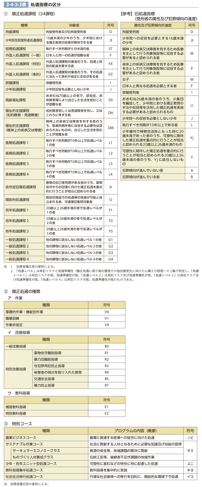 新たな処遇指標として導入された矯正処遇課程は、受刑者の年齢、心身の状況、執行すべき刑期、受刑者の改善更生及び円滑な社会復帰の支障となる事情等に照らし、一定の共通する特性等を有する受刑者の類型ごとに、重点的に処遇すべき内容を備えたものである。合計24の矯正処遇課程が設けられており、受刑者にとって最も必要性が高い課程を一つ指定し、当該矯正処遇課程の内容を中心に処遇が実施される。また、従来の「犯罪傾向の進度」に類似する概念である「再犯リスク」に加え、「矯正処遇に取り組む態度その他改善更生に向けた心構えの程度」を示す「処遇準備性」の評定を組み合わせ、個々の受刑者の特性に応じた処遇の在り方等を示す「処遇レベル」という新たな観点も取り入れられた。なお、懲役及び禁錮の受刑者に対しても、刑の趣旨に反しない限りにおいて、矯正処遇課程を指定し、処遇の充実を図っている。