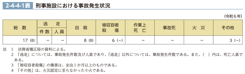 令和6年に刑事施設で発生した逃走、殺傷等の事故の発生状況は、2-4-4-1表のとおりである。