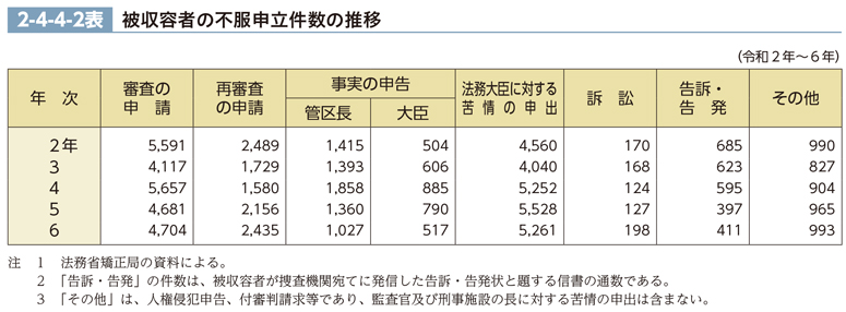 刑事施設の処置に対する被収容者の不服申立制度としては、一般的な制度として、民事・行政訴訟、告訴・告発、人権侵犯申告等がある。また、被収容者は、刑事収容施設法に基づき、刑事施設の長による一定の措置(信書の発受の差止めや懲罰等の処分等)については、その取消し等を求める審査の申請・再審査の申請を、刑事施設の職員による一定の事実行為(被収容者の身体に対する違法な有形力の行使等)については、その事実の確認を求める事実の申告をすることができる。いずれも、まず、矯正管区の長に対して申請・申告を行い、その判断に不服があるときは、法務大臣に対して、申請(再審査の申請)・申告を行うことができる。また、自己が受けた処遇全般について、法務大臣、監査官及び刑事施設の長に対し苦情の申出をすることができる。被収容者の不服申立件数の推移(最近5年間)は、2-4-4-2表のとおりである。