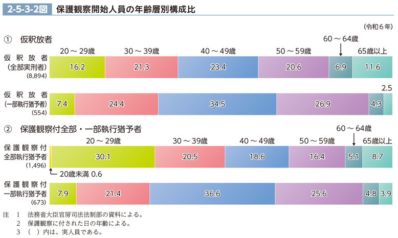 2-5-3-2図は、仮釈放者(全部実刑者及び一部執行猶予者)及び保護観察付全部・一部執行猶予者について、令和6年における保護観察開始人員の年齢層別構成比を見たものである。