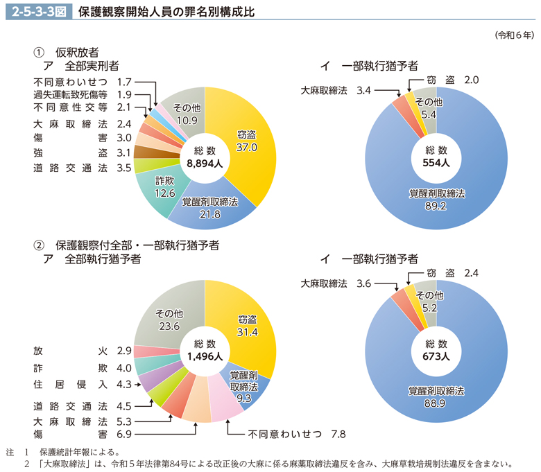 令和6年末の保護観察対象者の人員は、仮釈放者(全部実刑者)が3,288人(前年末比9.8%減)、仮釈放者(一部執行猶予者)が163人(同14.2%減)、保護観察付全部執行猶予者が5,510人(同7.6%減)、保護観察付一部執行猶予者が1,503人(同26.3%減)であった(保護統計年報による。)。