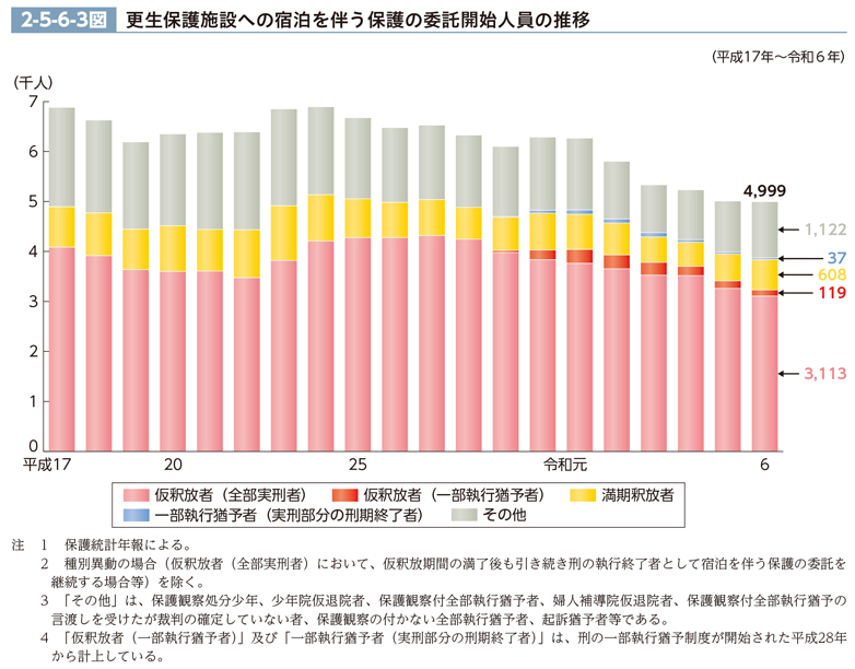令和6年における更生保護施設への宿泊を伴う保護の委託実人員は、6,497人(うち新たに委託を開始した人員4,999人)であった(保護統計年報による。)。更生保護施設へ新たに委託を開始した人員の推移(最近20年間)は、2-5-6-3図のとおりである。