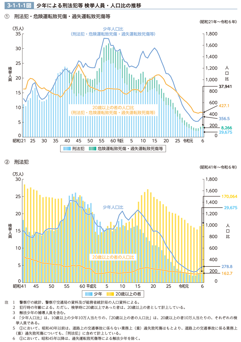 少年による刑法犯、危険運転致死傷及び過失運転致死傷等の検挙人員(触法少年の補導人員を含む。特に断らない限り、以下この節において同じ。)並びに人口比の推移(昭和21年以降)は、3-1-1-1図<1>のとおりである(CD-ROM資料3-1参照)。少年による刑法犯、危険運転致死傷及び過失運転致死傷等の検挙人員の推移には、昭和期において、26年の16万6,433人をピークとする第一の波、39年の23万8,830人をピークとする第二の波、58年の31万7,438人をピークとする第三の波という三つの大きな波が見られる。平成期においては、8年から10年及び13年から15年にそれぞれ一時的な増加があったものの、全体としては減少傾向にあり、24年以降戦後最少を記録し続けていた。令和に入ってからも戦後最少を更新し続けていたが、4年から3年連続で増加し、6年は、新型コロナウイルス感染症の感染拡大前である元年(3万7,193人)の水準を超え、3万7,941人(前年比9.1%増)であった。