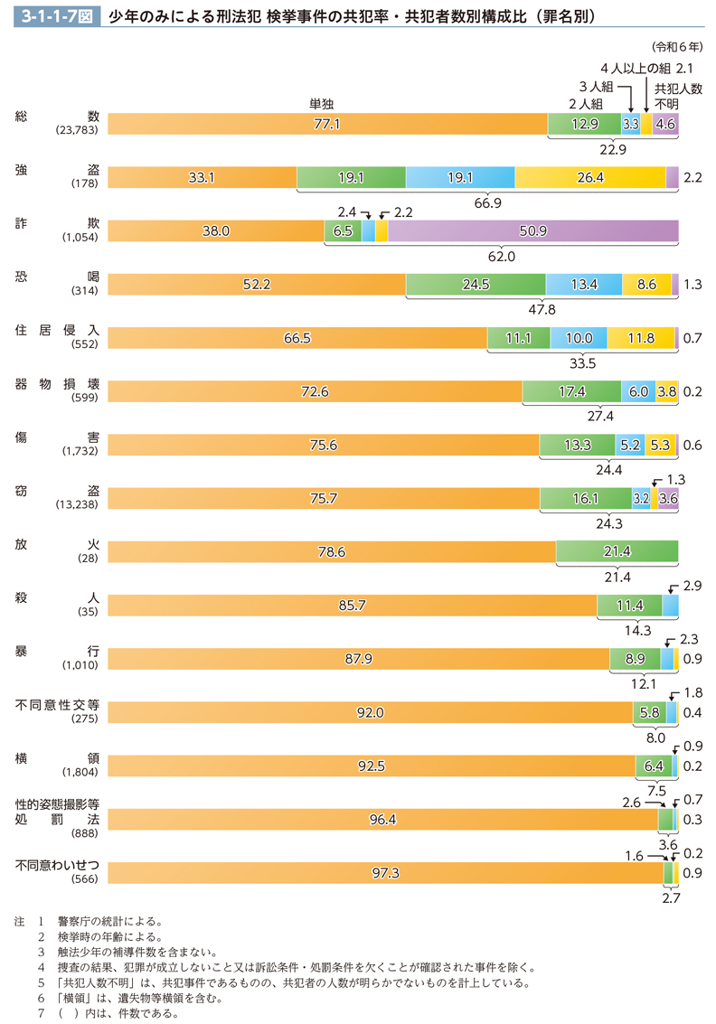 令和6年における刑法犯の検挙事件(触法少年の補導件数を含まない。また、捜査の結果、犯罪が成立しないこと又は訴訟条件・処罰条件を欠くことが確認された事件を除く。)のうち、少年のみによる事件(少年の単独犯又は少年のみの共犯による事件)での共犯率(共犯による事件数(共犯事件であるものの、共犯者の人数が明らかでないものを含む。)の占める比率をいう。)・共犯者数別構成比を主な罪名別に見ると、3-1-1-7図のとおりである。総数では、少年のみによる事件での共犯率は22.9%であり、20歳以上の者のみによる事件(20歳以上の者の単独犯又は20歳以上の者のみの共犯による事件)での共犯率(12.5%)と比べて高い(CD-ROM参照)。