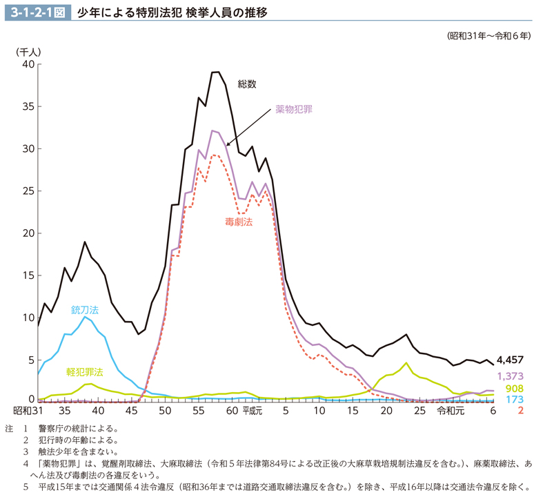 犯罪少年による特別法犯(平成15年までは交通関係4法令違反(昭和36年までは道路交通取締法(昭和22年法律第130号)違反を含む。)を除き、平成16年以降は交通法令違反を除く。以下この項において同じ。)の検挙人員の推移(昭和31年以降)は、3-1-2-1図のとおりである(罪名別検挙人員については、CD-ROM資料3-6参照)。その総数は、38年(1万8,967人)と58年(3万9,062人)をピークとする大きな波が見られた後、平成3年から18年にかけて大きく減少した。19年以降は増減し、令和6年は4,457人(前年比11.4%減)であった。罪名別に見ると、薬物犯罪(覚醒剤取締法、大麻取締法、麻薬取締法、あへん法及び毒劇法の各違反をいう。以下この節において同じ。)の人員は、昭和57年(3万2,129人)をピークとする大きな波が見られた後、平成26年(190人)を底として増加傾向にあったが、令和6年は1,373人(同2.0%減)であった。