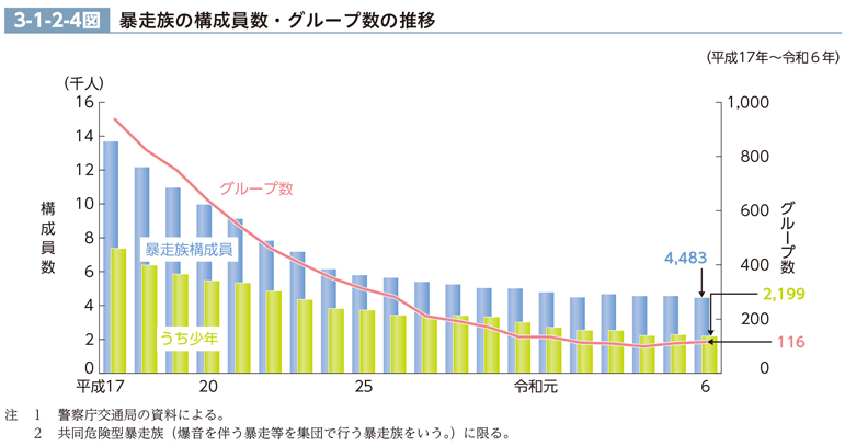 暴走族の構成員数及びグループ数の推移(最近20年間)は、3-1-2-4図のとおりである。