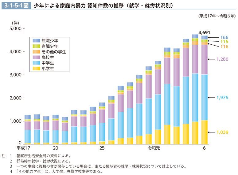 少年による家庭内暴力事案の認知件数の推移(最近20年間)を就学・就労状況別に見ると、3-1-5-1図のとおりである。認知件数の総数は、平成24年から増加傾向にあったが、令和6年は減少し、4,691件(前年比1.1%減)であった。特に、近年、小学生が大きく増加しており、6年は、平成17年(53件)の約20倍である1,039件(同6.6%増)であった。