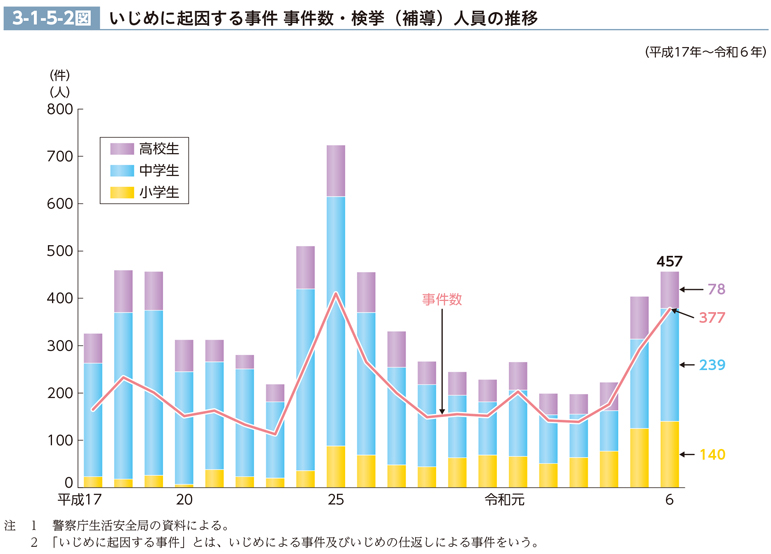 警察において取り扱ったいじめに起因する事件の事件数及び検挙(補導)人員の推移(最近20年間)を見ると、3-1-5-2図のとおりである。事件数及び検挙(補導)人員は、昭和60年に638件、1,950人を記録して以降、63年の97件、279人まで大きく減少し、平成25年に元年以降のピーク(410件、724人)を迎えた後、令和3年の139件、198人まで減少したが、4年以降増加しており、6年は377件(前年比29.1%増)、457人(同13.1%増)であった(CD-ROM参照)。