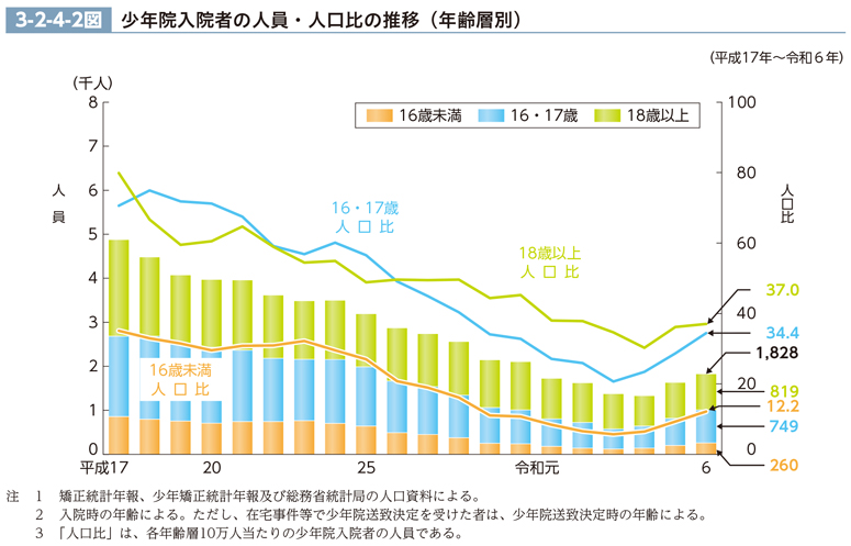 3-2-4-2図は、少年院入院者の人員及び人口比の推移(最近20年間)を年齢層別に見たものである。年齢層の区分において、最も高い区分を「18歳以上」としているのは、入院時に20歳に達している者がいることによる(以下(2)において同じ。)。少年院入院者の人員は、18歳以上では、平成13年に2,560人を記録した後、減少傾向にあったが、令和5年から増加し、6年は819人(前年比0.9%増)であった。16・17歳では、18歳以上と同様に、平成13年に2,583人を記録した後、減少傾向にあったが、令和4年から増加に転じ、6年は749人(同21.0%増)であった。16歳未満も、平成24年から減少していたが、令和4年から増加に転じ、6年は260人(同29.4%増)であった。同年の年齢層別構成比は、18歳以上(44.8%)が最も高く、次いで、16・17歳(41.0%)、16歳未満(14.2%)の順であった(CD-ROM参照)。