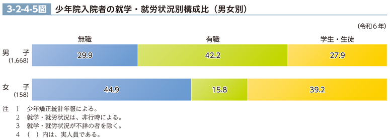 3-2-4-4図及び3-2-4-5図は、令和6年における少年院入院者の教育程度別構成比及び就学・就労状況別構成比を、いずれも男女別に見たものである。