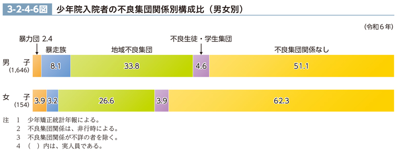 3-2-4-6図は、令和6年における少年院入院者の不良集団関係別構成比を男女別に見たものである。