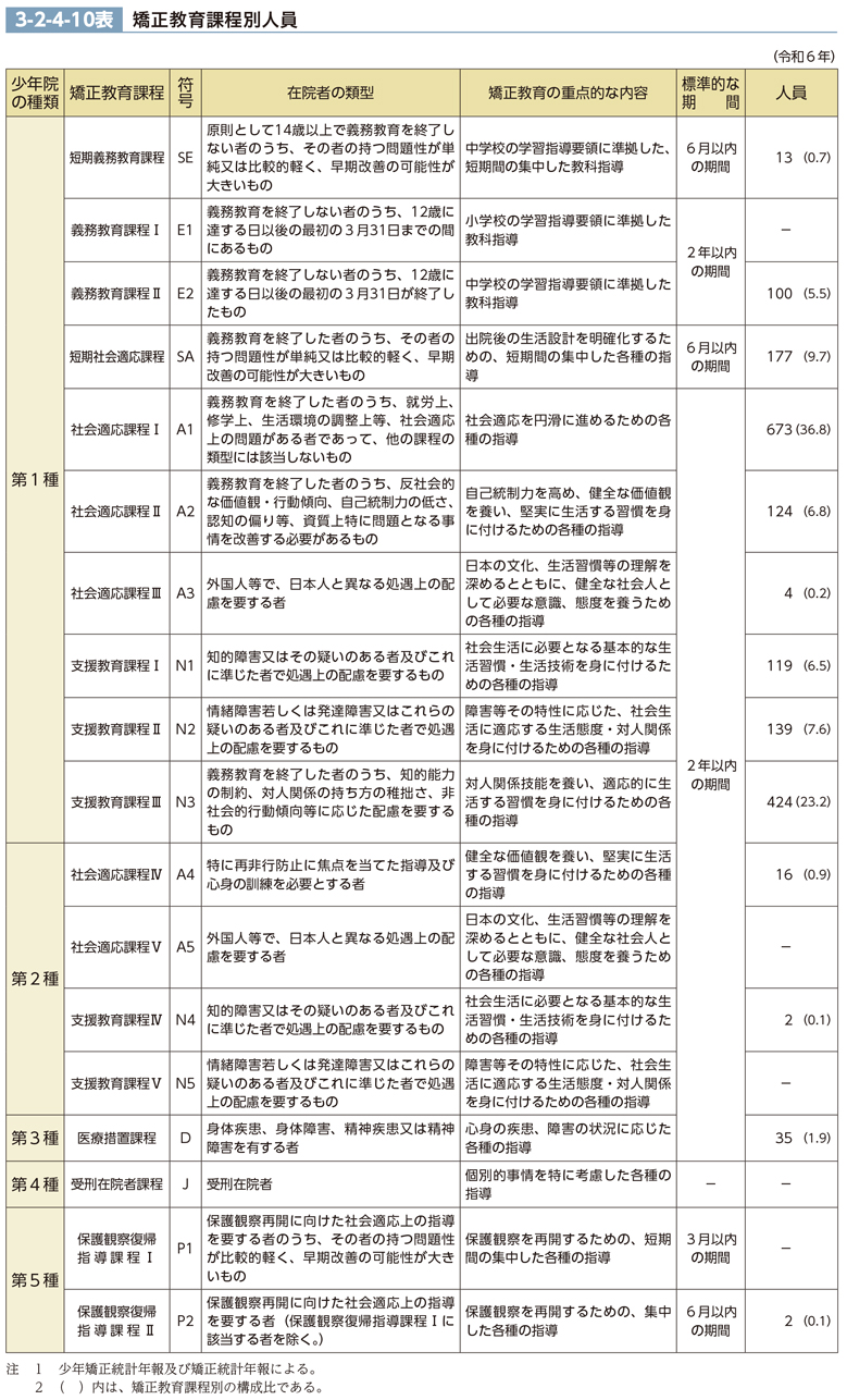 在院者の特性に応じて体系的・組織的な矯正教育を実施するため、各少年院には、その少年院が実施すべき矯正教育課程が指定されている。矯正教育課程は、在院者の年齢、心身の障害の状況及び犯罪的傾向の程度、在院者が社会生活に適応するために必要な能力その他の事情に照らして一定の共通する特性を有する在院者の類型ごとに、矯正教育の重点的な内容及び標準的な期間を定めたものである。矯正教育課程は、少年院の種類ごとに、3-2-4-10表のとおり定められており、令和6年における少年院入院者の矯正教育課程別人員は、同表の人員欄のとおりである。
