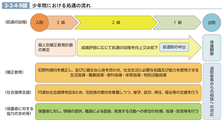 少年院の処遇は、少年院法に基づき、その人権を尊重しつつ、明るく規則正しい環境の下で、その健全な心身の成長を図るとともに、その自覚に訴えて改善更生の意欲を喚起し、自主、自律及び協同の精神を養うことに資するように行われる。その流れは、3-2-4-9図のとおりである。