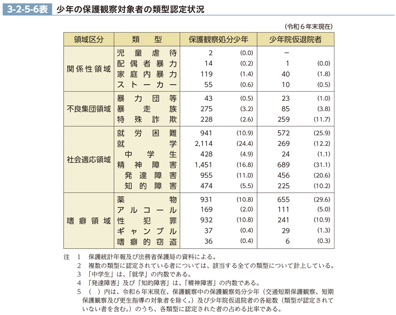 保護観察所においては、保護観察処分少年(交通短期保護観察、短期保護観察及び更生指導の対象者を除く。以下(1)において同じ。)及び少年院仮退院者に対しても、類型別処遇(第2編第5章第3節2項(2)参照)を実施している。令和6年末現在における保護観察処分少年及び少年院仮退院者の類型の認定状況を見ると、3-2-5-6表のとおりである。
