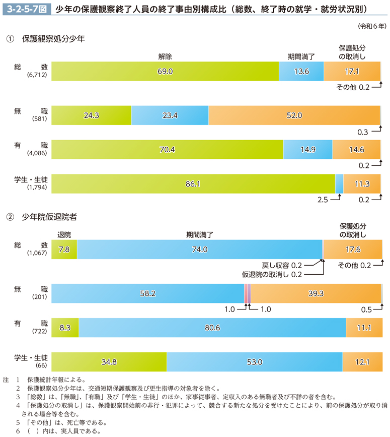 保護観察処分少年(交通短期保護観察及び更生指導の対象者を除く。以下この項において同じ。)及び少年院仮退院者について、令和6年における保護観察終了人員の終了事由別構成比を総数及び保護観察終了時の就学・就労状況別に見ると、3-2-5-7図のとおりである。保護観察終了時に無職である者は、保護観察処分少年では52.0%、少年院仮退院者では39.3%が、保護処分の取消し(競合する新たな処分を受けたことなどにより、保護処分が取り消されること)で保護観察が終了している(年齢層別の人員については、CD-ROM参照)。