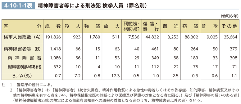 4-10-1-1表は、令和6年における精神障害者等(精神障害者及び精神障害の疑いのある者をいう。以下この節において同じ。)による刑法犯の検挙人員と、検挙人員総数に占める精神障害者等の比率を罪名別に見たものである。同年における刑法犯の検挙人員総数のうち、精神障害者等の比率は、0.7%であったが、罪名別で見ると、放火(12.3%)及び殺人(7.2%)において高かった。