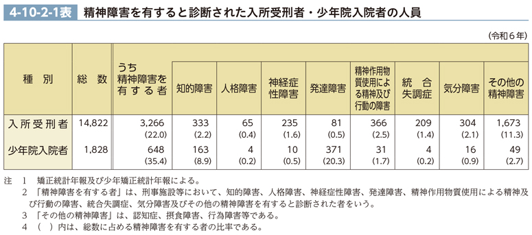 令和6年における入所受刑者及び少年院入院者の人員のうち、精神障害を有すると診断された者の人員と、入所受刑者及び少年院入院者の人員の総数に占める比率を精神障害の種別ごとに見ると、4-10-2-1表のとおりである(矯正施設被収容者に対する福祉的支援については、第2編第4章第3節4項(2)及び第3編第2章第4節3項(5)参照)。
