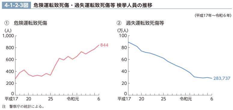 危険運転致死傷及び過失運転致死傷等の検挙人員の推移(最近20年間)を見ると、4-1-2-3図のとおりである。危険運転致死傷の検挙人員は、自動車運転死傷処罰法(本章第1節1項参照)が施行された平成26年以降は増加傾向にあり、令和6年は844人(前年比8.5%増)であった。過失運転致死傷等の検挙人員は、平成16年(90万119人)をピークにその後は減少傾向にあり、令和6年は28万3,737人(同4.6%減)であった(CD-ROM資料1-2参照)。