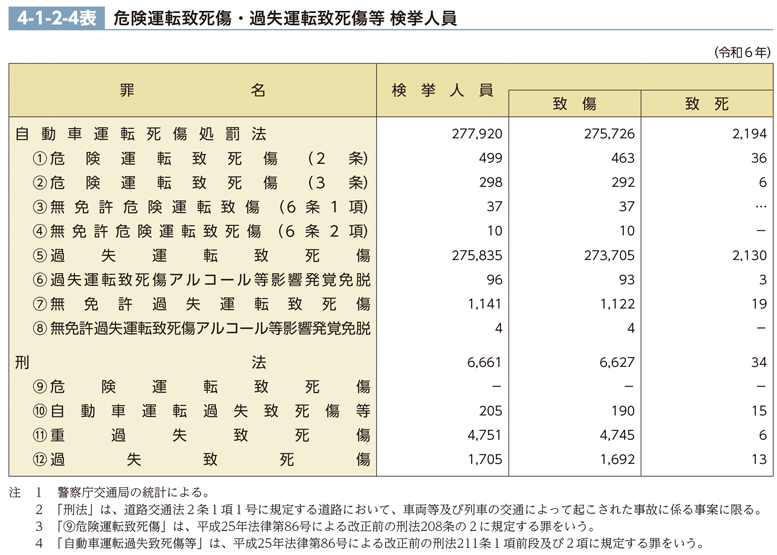 令和6年における危険運転致死傷・過失運転致死傷等の罪名別検挙人員は、4-1-2-4表のとおりである。両罪名については、自動車運転死傷処罰法(本章第1節1項参照)又は刑法が適用されるところ、危険運転致死傷(同表中自動車運転死傷処罰法における<1>~<4>及び刑法における<9>)の検挙人員は844人(前年比66人増)であり、うち致死事件の検挙人員は42人(同9人増)であった。過失運転致死傷等(同表中自動車運転死傷処罰法における<5>~<8>及び刑法における<10>~<12>)の検挙人員は28万3,737人(同1万3,685人減)であり、うち致死事件の検挙人員は2,186人(同24人減)であった(CD-ROM参照)。