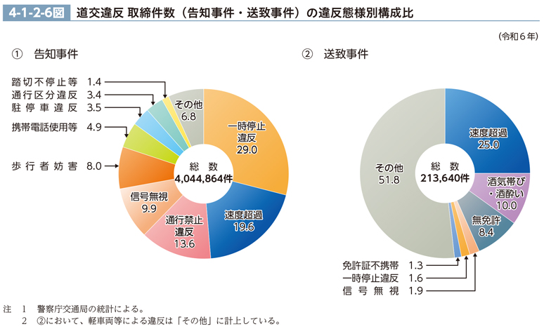 令和6年における道交違反の告知事件及び送致事件について、違反態様別構成比を見ると、4-1-2-6図のとおりである。