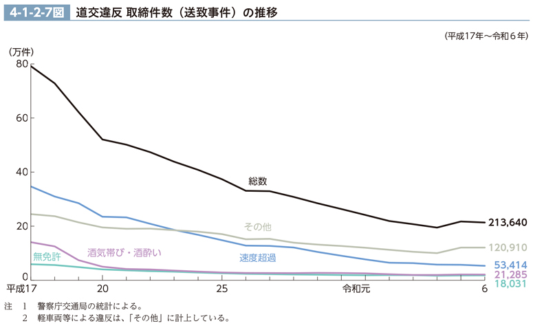 道交違反の取締件数は、告知事件(交通反則通告制度に基づき反則事件として告知された事件をいう。以下この項において同じ。)と送致事件(非反則事件として送致される事件をいう。以下この項において同じ。)を合わせた件数であり、平成15年以降800万件台で推移していたが、23年に800万件を下回ると、それ以降は減少傾向を示し、令和6年は425万8,504件(前年比27万3,365件(6.0%)減)であった(警察庁交通局の統計による。)。