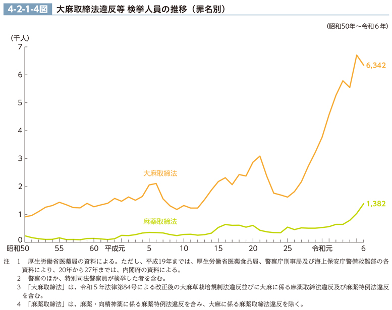 大麻取締法及び麻薬取締法の各違反(それぞれ、大麻及び麻薬・向精神薬に係る麻薬特例法違反を含む。大麻取締法違反は、大麻に係る麻薬取締法違反を含み、麻薬取締法違反は、大麻に係る同法違反を除く。以下この項において同じ。)の検挙人員(特別司法警察員が検挙した者を含む。)の推移(昭和50年以降)は、4-2-1-4図のとおりである(検察庁新規受理人員については、CD-ROM資料1-4参照)。大麻取締法違反は、平成6年(2,103人)と21年(3,087人)をピークとする波が見られ、26年から増加傾向にあり、令和6年は6,342人(前年比5.4%減)であった(CD-ROM参照)。なお、5年12月、大麻取締法及び麻薬及び向精神薬取締法の一部を改正する法律(令和5年法律第84号)が成立し、これにより、大麻等の不正な施用、所持、譲渡、譲受、輸入等についても、他の規制薬物と同様に、麻薬取締法における麻薬として禁止規定及び罰則が適用されることとなったことに留意が必要である(6年12月12日施行)。