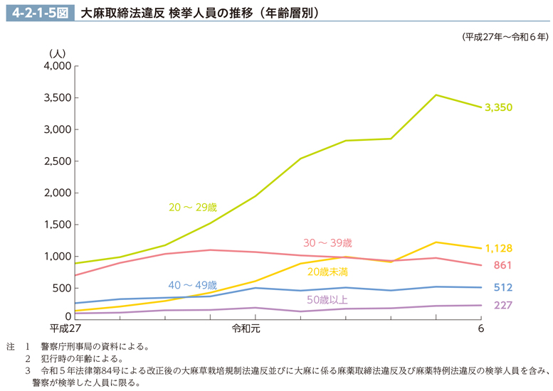 大麻取締法違反の年齢層別の検挙人員(警察が検挙した者に限る。)の推移(最近10年間)は、4-2-1-5図のとおりである。20歳代の検挙人員は、平成26年から増加し続けていたが、令和6年は3,350人(前年比5.5%減)と減少した。20歳未満の検挙人員も、平成26年以降増加傾向にあったが、令和6年は1,128人(同7.7%減)と減少した(CD-ROM参照)。同年の検挙人員の年齢層別構成比を見ると、20歳未満が18.6%、20歳代が55.1%、30歳代が14.2%、40歳代が8.4%、50歳以上が3.7%であり、30歳未満が全体の約7割を占めている。