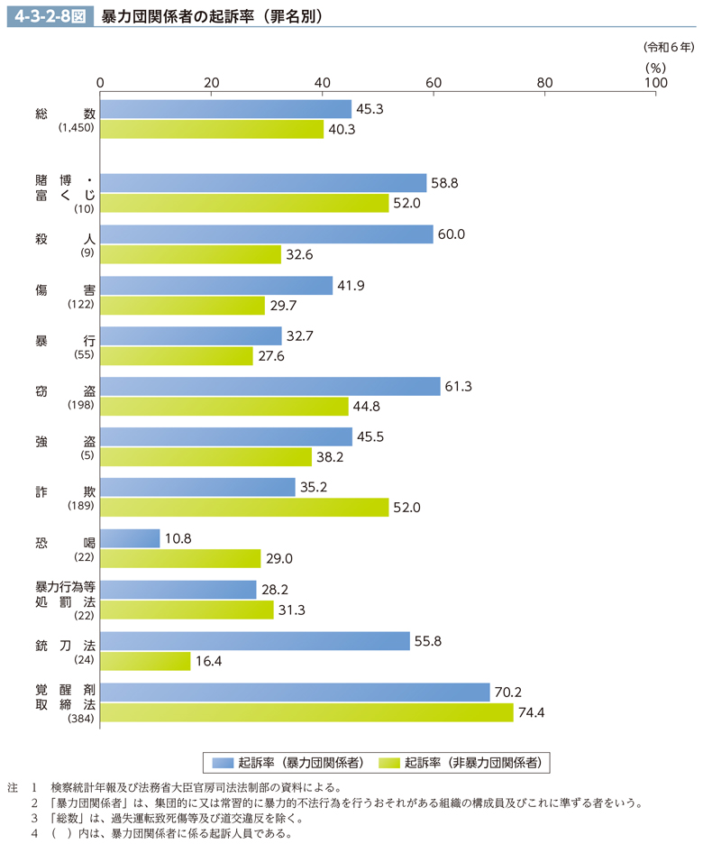 令和6年における暴力団関係者(集団的に又は常習的に暴力的不法行為を行うおそれがある組織の構成員及びこれに準ずる者をいう。)の起訴率を罪名別に見ると、4-3-2-8図のとおりである。