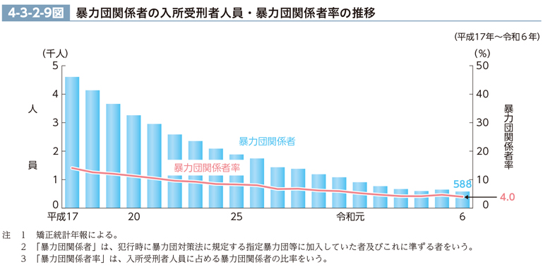 暴力団関係者(犯行時に暴力団対策法に規定する指定暴力団等に加入していた者及びこれに準ずる者をいう。以下(2)において同じ。)の入所受刑者人員及び暴力団関係者率(入所受刑者人員に占める暴力団関係者の比率をいう。)の推移(最近20年間)は、4-3-2-9図のとおりである。暴力団関係者の入所受刑者人員は、平成18年以降一貫して減少していたが、令和5年は前年と比べて増加し、6年は588人(前年比66人減)であった。同年の入所受刑者中の暴力団関係者について、その地位別内訳を見ると、幹部177人、組員333人、地位不明の者78人であった(矯正統計年報による。)。