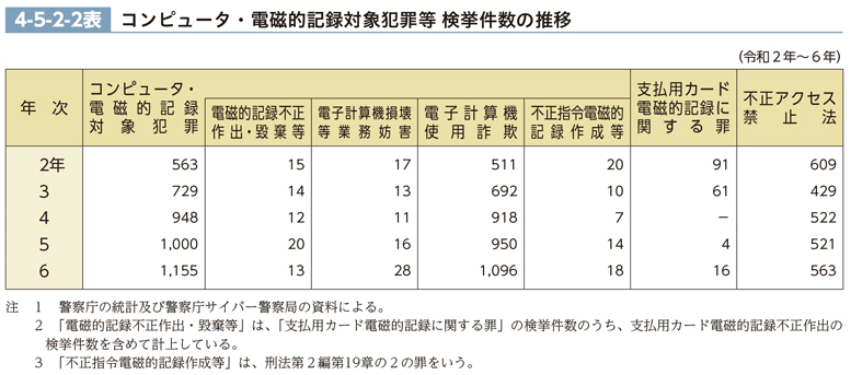 コンピュータ・電磁的記録対象犯罪、不正アクセス禁止法違反等の検挙件数の推移(最近5年間)は、4-5-2-2表のとおりである。電子計算機使用詐欺の検挙件数は、令和元年から6年連続で増加し、6年は1,096件(前年比15.4%増)と、平成12年以降最多であった(CD-ROM参照)。
